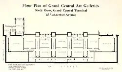 The board sought a location in Manhattan that was central and easily accessible. Through the support of Alfred Holland Smith, president of the New York Central Railroad, the top of the Grand Central Terminal was made available. The official street address was 15 Vanderbilt Avenue. The Painters and Sculptors Gallery Association signed a 10-year lease,[9] and together with the railroad company, invested more than $100,000 in preparations.[5] The Galleries extended over most of the terminal's sixth floor, 14,000 square feet (1,300 m2), and offered eight main exhibition rooms, a foyer gallery, and a reception area.[4] A total of 20 display rooms were to be created for what was intended to be "the largest sales gallery of art in the world."[5] The architect was Delano, best known for designing Yale Divinity School's Sterling Quadrangle.