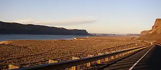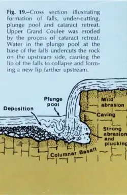 Evidence of the waterfalls includes a plunge basin where the falls began, immediately south of Coulee City. It contains at least 300 feet (91 m) of gravel lower than the open flooring of the land. The river above the falls was shallow and much wider than the gorge. Thus, it wrapped around the lip of the main falls creating lateral falls. These flowed until the recession of the main falls denied them water. Northrup Canyon in Steamboat Rock State Park contains a dry cataract as wide as Niagara Falls and three times as high.[7] Steamboat Rock, 880 feet (270 m) high and a 1 square mile (2.6 km2) in area, now stands as an isolated rise, but for a time it created two cataracts.[7] When the falls passed north of Steamboat Rock, it found a granite base beneath the basal flows. Granite lacks the close vertical joints of basalt and resisted the erosion from the cataract's plunge. It remains as hills on the broad floor of the Coulee.[7] Some gravel-bar deposits are visible along the Route 155. They provide evidence of eddies in the lee of rock shoulders.