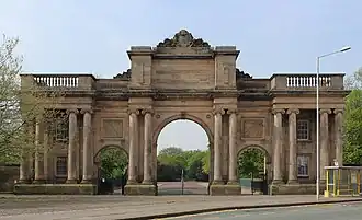 The Grand Entrance to Birkenhead Park is at the northeast entrance to Birkenhead Park in Birkenhead, Wirral, Merseyside, England. It consists of three arches flanked by lodges and is in Ionic style. The entrance was designed by Lewis Hornblower, with amendments by Joseph Paxton, the designer of the park. The park, and its entrance, were opened in 1847. The Grand Entrance is recorded in the National Heritage List for England as a designated Grade II* listed building.