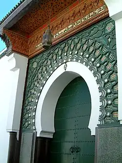The mosque is distinguished on the outside by its minaret and its entrance portal. The entrance portal is decorated with typical radiating geometric motifs, green colours, and a wooden canopy, mostly still dating from the time of Moulay Slimane.[3] The minaret, at the mosque's western corner, is typical of Alaouite-era minarets, inheriting the traditional form of Moroccan minaret architecture.[2] It has a large square shaft crowned by merlons and topped by a smaller, secondary shaft at its summit. Its facades are decorated with more geometric motifs and blind arches outlined in white stucco. In the negative space between the stucco outlines the surfaces are covered with green tiles or multicoloured tile mosaics.[2]