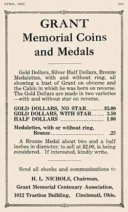 - ^ "Final sale of Grant Memorial coins (advertisement)". The Numismatist: 524. December 1922.