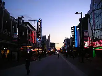 Prior to the establishment of the Entertainment District, the area was home to a number of movie theatres, which gave that stretch of Granville Street the nickname "Theatre Row".[2]