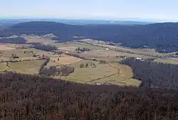 Although no extensive archaeological work has been conducted in Grassy Cove, early farmers found projectile points and other prehistoric artifacts when plowing fields, suggesting that Native Americans were living in the cove during prehistoric times.[7] Also, early 19th-century settlers reportedly found the cove bottom cleared and containing only high grass upon their arrival.[8] Hence the name: Grassy Cove.