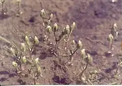 Gratiola heterosepala is a small annual herb with reddish-green stems, a few centimeters tall. The thin stems and small leaves are dotted with hairlike glands.