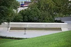 The design for the memorial included a small semicircular plaza, a low grey granite wall inscribed with quotations from Robert Kennedy's speeches (similar to the wall at the John F. Kennedy site), and a small reflecting pool.[31] The reflecting pool was designed to be only a few inches deep and about 4 feet (1.2 m) wide, and to extend the length of the wall. A straight granite pathway lead from the terrace at the John F. Kennedy grave to the semicircular plaza.[30] The original plan called for a grove of trees to be planted between the two Kennedy grave sites (to screen them from one another), another grove to be planted close by, and a large American Beech to be grown south of the plaza.[31]