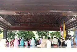 In the first years after Sukarno's burial, pilgrims would visit his grave and often took some of the soil, at some point causing concern that all the soil on his grave would be gone and forcing the government to regulate access to his grave.[4] By around 1977, dissatisfaction with Suharto's rule resulted in the loosening of the De-Sukarnoization policy and a rehabilitation of Sukarno's legacy, including his grave, and the following year the government decided to construct a mausoleum over the grave.[4][6] In 1979, on the ninth anniversary of Sukarno's death, Suharto dedicated the new mausoleum, in a ceremony attended by approximately one million people. Again, members of Sukarno's family criticized the decision to build the mausoleum, with Sukarno's son Guntur saying that Sukarno's family was not involved in the mausoleum's construction.[6] Regardless, high-ranking officials of Suharto's government would make publicized pilgrimages to the tomb, and in 1980 1.4 million people visited the site.[8]
