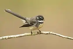 The grey fantail (Rhipidura albiscapa) is a small insectivorous bird. There is no sexual dimorphism.[3] It is a common fantail found in Australia, the Solomon Islands, Vanuatu and New Caledonia. The species is considered by many to be conspecific with the New Zealand fantail (Rhipidura fuliginosa);[4] however, differences in its calls lead some authorities to treat it as a separate species.[2][5] The studies of grey fantail in 1999 by Richard Schodde and Ian Mason recommended that Tasmanian grey fantail was formally classified as R. albiscapa and New Zealand fantails populations as R. fuliginosa[6]