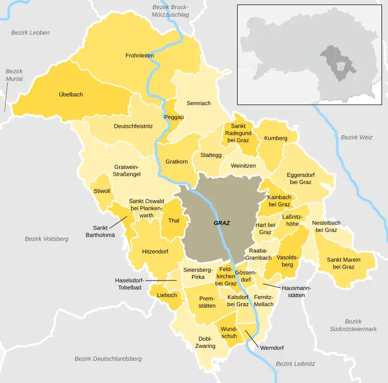 Bezirk Graz-Umgebung (German: [ɡʁaːt͡s umˈɡeːbuŋ], lit. Graz Surroundings) is a district of the state of Styria in Austria. It forms a continuous ring around Graz, the capital city of Styria and also the seat of the district commission.