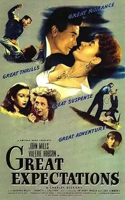 Great Expectations is a 1946 British drama film directed by David Lean, based on the 1861 novel by Charles Dickens and starring John Mills and Valerie Hobson. The supporting cast included Bernard Miles, Francis L. Sullivan, Anthony Wager, Jean Simmons, Finlay Currie, Martita Hunt and Alec Guinness.