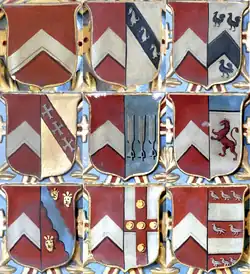 18. ^ Given incorrectly by Vivian, 1895, p.378 as the arms of Cantilupe. The arms of Denys were the arms of Cantilupe debruised by a bend engrailed azure, suggesting some unknown feudal or familial connection with the Cantilupe family. Thomas de Cantilupe (c. 1218 – 1282), Bishop of Hereford, was the first of his family to adopt the jessant-de-lys arms, which he showed reversed, i.e. upside-down, which replaced the ancient Cantilupe arms of three fleurs-de-lys, visible on the Bishop's seal. They became in his honour the arms of the See of Hereford. These arms of Denys were later used by the Tennyson family (perhaps "Denys's son") of which the poet Alfred, Lord Tennyson was a member. The arms of Bonville are not shown on the escutcheon, possibly as John Bonville of Combe Raleigh was a bastard, but the arms of his heiress wife Denys are shown