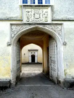 Tudor main entrance to courtyard pierced through east front, Great Fulford House. Beyond is the front door leading to the great hall in the west wing. Above is an Elizabethan (16th century) relief sculpted panel showing the arms of Fulford of nine quarters within a strapwork surround with supporters two Saracens