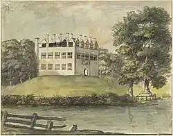 Great Fulford House, view from south-east. 1780 watercolour, British Library.[1] The later remodelling by James Wyatt in 1805 replaced the gables with battlements and added full height bay windows at the corners