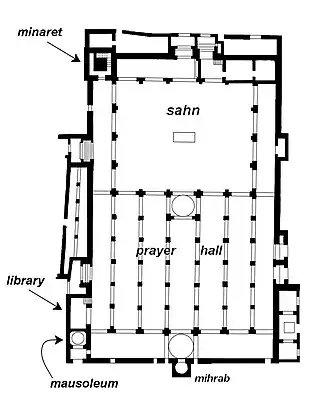 The mosque's overall layout reflects the "T-plan" that became standard in western (Maghrebi) mosques in the Almohad period.[3][4] The building has a rectangular floor plan, measuring about 54 by 34 meters and covering about 2000 square meters.[3][4] The layout includes a vast hypostyle interior prayer space and a large rectangular courtyard (sahn) occupying most of the northern part of the building.