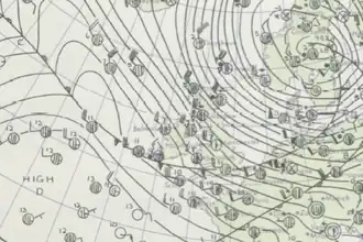 Being on the leeward side of the Pennines in the prevailing wind direction, Sheffield is usually relatively protected from the effects of high wind events which may have more serious impacts on surrounding areas. However, on this occasion, the winds were funnelled through the valleys of the River Don, River Sheaf and other rivers down into the centre of the city, creating higher wind speeds than seen elsewhere in the country inland and at similar altitudes.[2][3] The cause of this funnelling effect was a temperature inversion, which meant that high winds generated over the higher ground to the west of the city were unable to escape the surface layer, instead effectively "bouncing" off the underside of the inversion layer and being funnelled down into the lower levels of the city.[4] This also gave the winds a variation variable, gusty and turbulent nature, increasing damage further.[4]