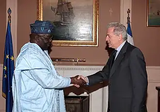 Greece and Nigeria enjoyed close ties before the Nigerian military regime took power in December 1983. In February 2000, the Nigerian embassy in Greece was re-established after a 16-year absence.[5] Relationships between the countries are now generally good.[6] On March 25, 2009, the outgoing Greek Ambassador to Nigeria, Haris Dafaranos, stated that Greece would continue to explore new areas of cooperation and boost cultural, economic, scientific and technological ties with Nigeria.[7] This was confirmed when, on 22 April 2009, Greek Deputy FM Petros Doukas and visiting Nigerian Commerce and Industry Minister Charles Ugwuh signed a bilateral agreement in the economic, scientific and technology sectors. Ugwuh said "it is important, following a century of transactions between Greece and Nigeria, that an official agreement (on cooperation) was signed today".[8] The two countries are discussing partnership in the development of the Free Trade Zones in Nigeria.[9]