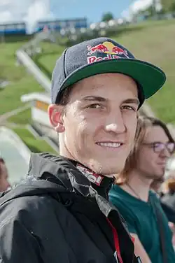 Gregor Schlierenzauer was born on 7 January 1990 in Innsbruck, Tyrol, to Paul and Angelika Schlierenzauer.[5] The second of three children, he has an older sister, Gloria, and a younger brother, Lukas. His uncle is Markus Prock, the winner of three Winter Olympic medals in men's luge, who settled him a contract with Fischer Skis in 2001 and a few years later with Red Bull. Schlierenzauer has been deaf in his left ear since birth.[5] He is also the cousin of luger Hannah Prock.[6]