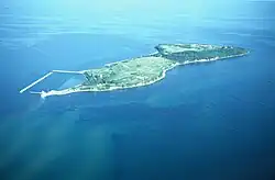 By 1850 three families that let the island from the city permanently settled on the island and lived from fishing as well as farming. Between 1853 and 1855 the architect Hermann Kirchhoff constructed a lighthouse on the island.[4] In 1865 the island had 41 residents. Between 1873 and 1877 a fishing harbor was built on the island which also assisted fishermen nearby that were in maritime emergency.[5] In 1883 the island was sold to the Prussian state by Greifswald as the city could not longer afford to keep the lighthouse and the emergency rescue operations running. The island was used by tourists and became a popular spot for vacationing, and especially swimming, between 1877 and 1937. Tourists were brought to and from the island with a steam-powered ferry that serviced the location multiple times a day.