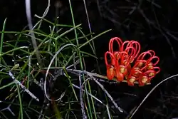 Red Lake grevillea grows in heath and mallee scrub between Lake King and south of Salmon Gums in the Esperance Plains and Mallee biogeographic regions of south-western Western Australia.[4][1]