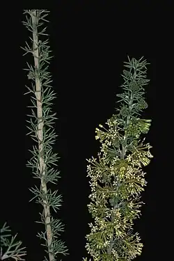 Grevillea erinacea is a spreading shrub that typically grows to a height of 0.3–1.8 m (1 ft 0 in – 5 ft 11 in), its branchlets covered with woolly to more or less silky hairs. Its leaves are rotated through 90°, 10–35 mm (0.39–1.38 in) long and deeply divided with three to five sharply pointed lobes 5–20 mm (0.20–0.79 in) long and 0.6–1 mm (0.024–0.039 in) wide. The flowers are arranged in more or less spherical to dome-shaped groups along a woolly-hairy rachis. The flowers are greenish in bud, later cream-coloured and silky hairy, the pistil 2.5–4.5 mm (0.098–0.177 in) long with a white style. Flowering occurs from July to December, but mainly from July to October and the fruit is a mostly smooth, oblong to oval follicle 7.5–10 mm (0.30–0.39 in) long.[4][2]