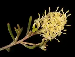 Grevillea inconspicua is an erect shrub that typically grows to a height of 0.3–2.3 m (1 ft 0 in – 7 ft 7 in) and has silky-hairy branchlets. The leaves are crowded and circular in cross-section or linear, 5–25 mm (0.20–0.98 in) long, 0.5–1.5 mm (0.020–0.059 in) wide and silky-hairy. The flowers are arranged in usually branched clusters 10–20 mm (0.39–0.79 in) long on the ends of branches and are bright yellow or golden yellow, the pistil about 7 mm (0.28 in) long. Flowering occurs from September to November and the fruit is a cylindrical to oval follicle 10–16 mm (0.39–0.63 in) long.[3][4]