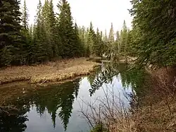 Griffith Woods is surrounded by the neighbourhood of Discovery Ridge to its north, the Tsuu T'ina Nation 145 reserve to the south, the Elbow Springs Golf Club to the west and the Stoney Trail to its east. It is a forested park next to the Elbow River featuring multiple oxbow wetlands and beaver ponds.[1] Powerlines cut through the middle of the park leaving a narrow open area. Near the eastern edge of the park is the Discovery Ridge Pond, a manmade stormwater pond.[2] The park features numerous interconnecting trails which can be accessed in multiple places from Discovery Ridge as well as by the parking lot near the middle of the park.