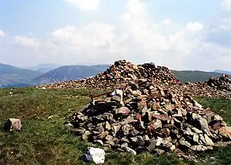 The top bears a massive stone cairn together with two smaller ones, built from the many specimens lying near the summit on an otherwise grassy dome. The main cairn gives the fell its alternative local name, Stone Man. A weather station is a rather more modern addition to the summit decorations.[1][2]