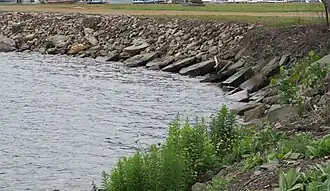 The Grindstone City Historic District consists of about 250 acres of land, including quarry sites and two original buildings. At the time of nomination, there were no other buildings on the site, although subsequently a portion has been turned into a subdivision. Most of the quarry pits have been filled with rubble, and trees cover the operations. Two jetties extend out into Lake Huron.[2]