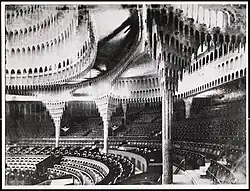 In 1917, the property was sold to Deutsches Nationaltheater AG,a network of theaters managed by Max Reinhardt, a leading figure in Berlin's theater scene. Reinhardt, who became director of the Deutsches Theater Berlin in 1905, expanded his influence to include several venues in Berlin and Vienna, such as the Volksbühne and the Theater am Kurfürstendamm.[4] Hans Poelzig was commissioned to rebuild the circus space into a revue theater starting in 1918. He added several stories onto the old market hall and redesigned the interior in a distinctive expressionist style, creating a massive dome and covering the wrought-iron ceiling in hanging stalactite-like stucco, which became known as the "Tropfsteinhöhle" ("stalactite cave").[2] The foyer was decorated with cantilevered light columns designed in part by Poelzig's wife, Marlene. Between 1919 and 1921, Reinhardt used the Großes Schauspielhaus to stage several productions, including The Oresteia, Danton's Death, and Julius Caesar. These productions were known for their elaborate staging and made full use of the theater's advanced technical features, including a revolving stage, a cyclorama, and an adjustable forestage.[5] The theater was referred to as the "Theater of Five Thousand".[1] In the 1920s, the theater became one of the first venues in Berlin to feature revues, under the direction of Erik Charell. In 1928, participants for a new vocal sextet, the Comedian Harmonists, were recruited from the theatre's in-house choir.[6]