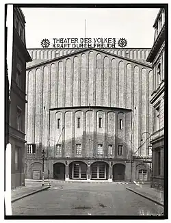 In 1934, the NSDAP renamed the theatre Theater des Volkes ("Theatre of the People"), which was promoted under the aegis of Strength through Joy program and overseen by Joseph Goebbels.[3][2] In 1938, workers of the German Labour Front destroyed the expressionist "stalactite cave" and exterior features added by Poelzig, and the interior was redesigned by Nazi architect Fritz Fuß in a typical stripped classical style. A "Führerloge" ("Führer's Loggia") was installed at the back of the theatre space.