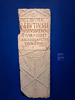 The pivoting bracket on the top of the staff was suggested in the 1912 reconstruction by Adolf Schulten and confirmed by Matteo Della Corte soon afterwards.[13] However, as asserted by Thorkild Schiöler in 1994,[14] the 5-kilogram cross found in Pompeii is too heavy to be supported in this way, thus the bracket had never existed. Furthermore, there is no archeological evidence of the bracket, and the images of gromas on tombstones do not show it.[15] The archeologists rejecting the bracket suggest that the staff was slightly angled to permit sighting without the pole obscuring the view.[16]