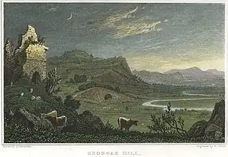 During the 19th century there were two translations of Dyer's celebration of the Welsh countryside at the tail end of the Welsh literary renaissance. The first was the “Duoglott Poem, faithfully imitated” as Twyn Grongar by Rev. Thomas Davies in 1832.[27] A second, Bryn y Grongaer, was written by William Davies (1831–1892) under his bardic name of Teilo.[28] The site itself was painted early in the century by Henry Gastineau and later appeared as a woodcut in Wales Illustrated (1830).