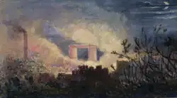 A third blast furnace was constructed and began production in 1876.[45] Several negative factors affected the works after the mid-1870s: a drop in iron prices of 75% in the late 1870s; difficulty in obtaining coal during a strike in the Durham Coalfield around 1879, and industrial problems at the works in 1880. The works closed in 1891, and were offered for sale and the buildings demolished in the early 1890s. As a result of its closure, the village population dropped to 872 by 1901.[46] The works produced an estimated one million tons of slag. After closure the slag heaps were reprocessed to make road stone, and slag wool; reprocessing continued until at least the early 1930s. The brickworks expanded during the first decades of the 20th century: its 390-foot (120 m) chimney was built in 1902; and a Hoffmann kiln was constructed in 1923; the brickworks operated until 1957.[47]