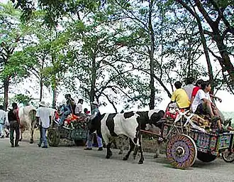 Typical Costa Rican ox-drawn carts carry wood during an annual festival in Nicoya, Guanacaste.