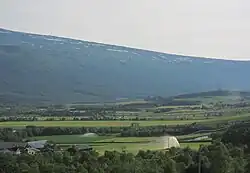 The Gudbrandsdalen valley includes the most arid area in Norway. In Skjåk Municipality the average annual precipitation is only 278 millimetres (10.9 in).[13] The valley sits in the rain shadow of the mountains west (including Jotunheimen), north, and east of the valley.[14] The valley is less incised than the valleys of western Norway.[15] Farming is mostly confined to the relatively narrow areas along the rivers. Gudbrandsdalen and adjacent valleys are surrounded by wide uplands and mountain plateaus traditional used as seter or summer farms.[7]