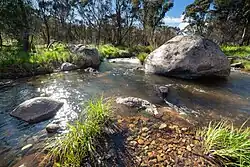 Formed by the confluence of Bogong Creek and Middle Creek, the Gudgenby River rises within Namadgi National Park, below Yankee Hat and Mount Gudgenby, on the south-eastern slopes of the Brindabella Range in the south of the Australian Capital Territory (ACT). The river flows generally north and north-east, joined by nine tributaries, including the Naas River and Orroral River, before reaching its confluence with the Murrumbidgee River, near Tharwa. The river descends 422 metres (1,385 ft) over its 35 kilometres (22 mi) course.[1]