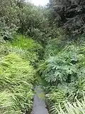Only slightly smaller is Gunnera masafuerae of the Juan Fernandez Islands off the Chilean coast. They can have leaves up to 2.9 m (9 ft 6 in) in width on stout leaf stalks 1.5 m (4 ft 11 in) long and 11 cm (4+12 in) thick according to Skottsberg.[15] These leaf stalks or petioles are the thickest of any dicot, and probably also the most massive. On nearby Isla Más Afuera, Gunnera peltata frequently has an upright trunk to 5.5 m (18 ft 1 in) in height by 25–30 cm (10–12 in) thick, bearing leaves up to 2 m (6 ft 7 in) wide. The Hoja de Pantano (Gunnera magnifica) of the Colombian Andes bears the largest leaf buds of any plant; up to 60 cm (2 ft) long and 40 cm (16 in) thick.[16] The succulent leaf stalks are up to 2.7 m (8 ft 10 in) long. The massive inflorescence of small, reddish flowers is up to 2.3 m (7 ft 7 in) long and weighs about 13 kg. The flowers of Gunnera species are dimerous ( two sepals, two petals (or none), two stamens (or one), and two carpels.[17] Other giant Gunnera species within the subgenus Panke are found throughout the Neotropics and Hawaii. Gunnera insignis is also known by the name "poor man's umbrella" in Costa Rica.