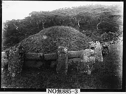 He developed a serious disease in July 975 (fifth month of the Lunar calendar) and died just a few days later at the age of 50.[2] He was given the posthumous name of "Hongdoseon-yeolpyeongse sukheon-ui hyoganghye daeseong dae-wang" (홍도선열평세숙헌의효강혜대성대왕; 弘道宣烈平世肅憲懿孝康惠大成大王),[16] while his temple name Gwangjong means "shining emperor". His tomb, called Heolleung (헌릉; 憲陵), is located on the north side of Songaksan, in Kaepung County, North Korea. The site inspection in 1916 found a severely damaged tomb, but the stairway and the foundation stone are preserved.[17][18]