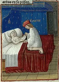 "How King Artus slept each day with the Lady of Camelide and promised to marry her." An illustration from Lancelot en prose (c. 1494)