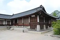 One of the main buildings used for the education of the crown prince.[153] It was first built in 1427. It was destroyed in 1592 and rebuilt in 1865.[154] It was again destroyed in the 1867 fire, and was rebuilt by 1888.[155] In 1914, the building was sold and later reassembled in the private home of a Japanese businessman Ōkura Kihachirō in Tokyo.[156] It was destroyed in the 1923 Great Kantō earthquake.[155] Its remains were returned to Korea around 1996,[157] and are now on display near Geoncheonggung.[158] In 2001, Jaseondang was rebuilt on its original spot.[159] |
