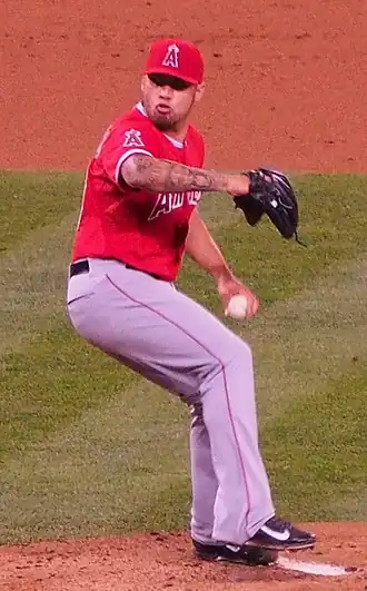 Santiago was traded to the Los Angeles Angels of Anaheim on December 10, 2013, in a three-team trade involving the Chicago White Sox, the Arizona Diamondbacks, and the Los Angeles Angels. The Angels received Tyler Skaggs along with Santiago, while the White Sox received Adam Eaton and the Diamondbacks received Mark Trumbo, Brandon Jacobs, and A. J. Schugel.[8][9] In his first season in Anaheim, Santiago was fairly inconsistent, he averaged less than 6 innings per start and for a moment was sent to the bullpen, where he made 6 appearances while also starting 24 times for the Angels. In 127+13 innings, Santiago went 6-9 with a 3.75 ERA.