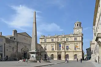 The first town hall in Arles was a medieval building, between to the Palais des Podestats on the Plan de La Cour, and the clock tower, which dated back to the early 16th century.[2][3] The clock tower itself was surmounted by a bronze statue of the god, Mars, which was cast by Laurent Vincent of Avignon in 1515.[4]