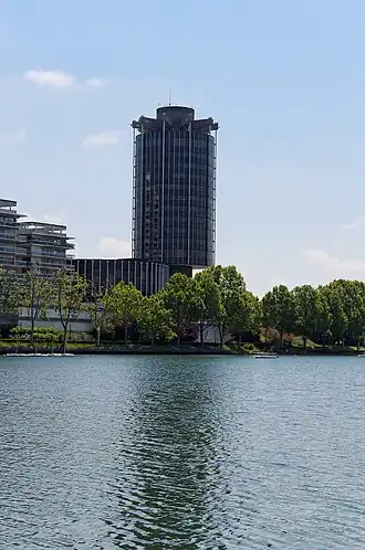 Following a substantial increase in the population, the town council decided to commission a more substantial town hall. The site they selected was on the east bank of the Lac de Créteil, a former quarry which had been rejuvenated as a large water feature.[6][7] Construction of the new building started in 1972. It was designed by Pierre Dufau in the modern style, built in steel and glass and was officially opened by the mayor, Pierre Billotte, on 5 December 1974.[8] The layout involved a four-storey drum-like structure, which accommodated the civic rooms, and an-11-storey circular tower, which accommodated the municipal offices and was 75 metres (246 ft) high. Internally, the principal rooms included the Salle du Conseil (council chamber) and the Salle des Mariages (wedding room).[9][10][11]