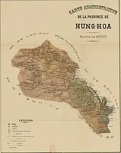 The Deos continued to pay annual tribute to the Hue court to assert their semi-autonomous status while also paying tribute to the Thai court via Laotian kingdoms. The headquarters of the Deos were relocated to Lai Châu. Around 1840s, Deo lord Đèo Văn Trị saw the Hmong people from China migrated and settled on his lands in Lai Châu.[2] When the Yellow Flags from China attacked in 1872, the Deos successfully resisted the invaders and were rewarded by Vietnamese emperor Tu Duc. Deo Van Seng was rewarded as the tri châu of Ninh Biên district, while his son Đèo Văn Trị was appointed as the tri châu of Lai Châu district.[3] French forces took Hưng Hóa in April 1884. The province therefore had been reorganised many times by French administration from 1887 to 1900. Finally, the last remnant of Hưng Hóa was absorbed by the new Phú Thọ province in 1903.