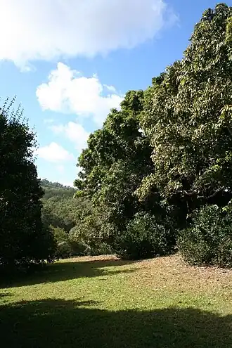 The H2 Hinde (Macadamia integrifolia) tree is situated in a corridor of trees running north to south that divides the block in two in this area. It is approximately eight metres tall and has a metal tag painted with orange over one of its main branches, apparently put there by JM Wills during his survey work for the Queensland Department of Agriculture and Stock in 1948 and identifying it as a parent tree. The H1 and H3 macadamia trees were located between five and ten metres to the south. None of the H3 Stevenson trees survive. The remaining H1 Colliston is located about two metres to the east of the outhouse.[1]