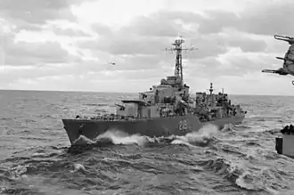 Following Korea, Athabaskan underwent a major refit, recommissioning on 25 October 1954 as a destroyer escort.[7] On 1 January 1955, Athabaskan was assigned to the Second Canadian Escort Squadron of Pacific Command.[8] While on a training cruise with HCMS Cayuga, the 16-year-old female stowaway Joan Pilapil was discovered on 7 August 1955.[1] In November 1955, the Second Canadian Escort Squadron was among the Canadian units that took part in one of the largest naval exercises since the Second World War off the coast of California.[9]