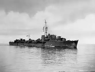HMS Panther was a P-class destroyer built for the Royal Navy during the Second World War. After commissioning on 12 December 1941, she made a short trip to Iceland with the battleship King George V, then escorted a British convoy to India. In early April 1942, Panther rescued survivors from two cruisers sunk in the Indian Ocean, after which she took part in Operation Ironclad, the Allied invasion of Vichy French-held Madagascar, and sank a French submarine with another destroyer. Panther then returned to the Mediterranean, and participated in the Allied landings in North Africa, but was severely damaged in an air attack and had to undergo repairs in Gibraltar. After taking on survivors from the torpedoed SS Strathallan, Panther escorted two Allied convoys in the Atlantic. She next supported the Allied attack on Sicily, then sailed to the Aegean Sea in the Dodecanese Campaign. On 9 October 1943, Panther was sunk by German Stuka dive-bombers with 33 dead.