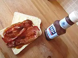 HP Sauce is a British brown sauce,[2] the main ingredients of which are tomatoes, malt vinegar and molasses. It was named after London's Houses of Parliament. After making its first appearance on British dinner tables in the late 19th century, HP Sauce went on to become an icon of British culture.[3] It was the best-selling brand of brown sauce in the UK in 2005, with 73.8% of the retail market.[4] The sauce was originally produced in the United Kingdom, but is now made by Heinz in the Netherlands.