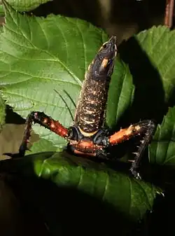 Both sexes, like all species of this genus, have many pointed spines on their bodies and legs. The shortened tegmina has developed front wings completely cover the just as shortened hind wings. Females are dark brown in color and very compact in shape. The abdomen of egg-laying specimens in particular bulge in shape. The abdomen ends in a spike-like secondary ovipositor. Characteristic is a triangular or oval area in front of the wings, which is white to beige in the otherwise black-brown female nymph and only light brown to beige in the adult, then-brown females. In contrast to the top, the bottom is very vividly drawn. Female nymphs in particular have bright orange areas on the undersides of the femura, the meso- and metathorax, the intermediate membranes of the abdominal segments and other smaller orange areas on the sternites of the abdomen itself. Females are larger than males, being 90 to 110 millimetres (3.5 to 4.3 in) long. The males are much slimmer, very prickly and only about 65 to 75 millimetres (2.6 to 3.0 in) long. They are mostly dark brown in color and thus more closely resemble the nymphs in their coloration. With them, the front edge of the tegmina is often drawn lightly, which results in two short, light lines at the lateral edge of the wings.[2][3]