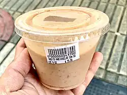 Habichuelas con dulce is made with red beans, cinnamon, nutmeg, coconut milk, evaporated milk, raisins, sugar and salt.[2] The beans are boiled with cinnamon sticks and sweet cloves and then blended to the consistency of soup. The coconut milk and evaporated milk are added along with cooked sweet potato chunks.[3] Cloves and ginger can also be added as flavorings.