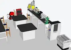 The building or facility the hackerspace occupies provides the physical infrastructure that members need to complete their projects. In addition, most hackerspaces provide electrical power, computer servers, and networking with Internet connectivity. Well-equipped hackerspaces may provide machine tools, sewing, crafting, art fabrication, audio equipment, video projectors, game consoles, electronic instrumentation (such as oscilloscopes and signal generators), electronic components and raw materials for hacking, and various other tools for electronics fabrication and creating things.[14] Specialized large-format printers, 3D printers, laser cutters, industrial sewing machines, CNC machine, or water jet cutters may be available for members to use. Some hackerspaces provide food storage and food preparation equipment, and may teach courses in basic or advanced cooking.